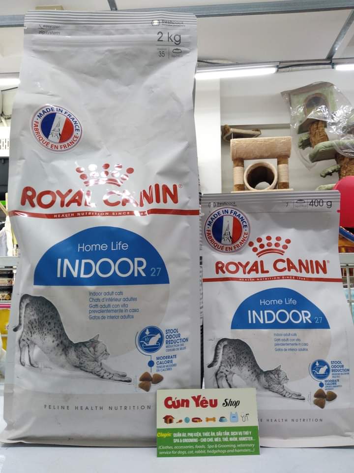 - Royal Canin Indoor 27 400g | 2kg | 10kg – Là một trong những dòng thức ăn cho mèo nổi tiếng và được mua nhiều nhất của Royal Canin. Sản phẩm phù hợp với mèo trưởng thành trên 12 tháng tuổi.